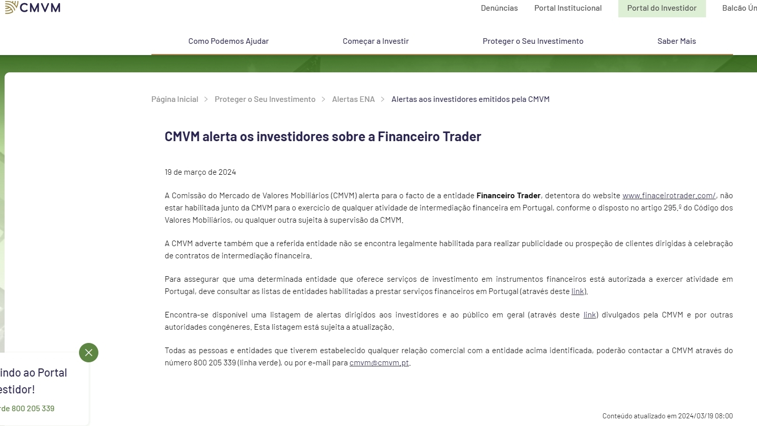 Il 19 marzo 2024 la commissione del mercato dei valori mobiliari (cmvm) avvisa del fatto che l'entità finanziaria trader, proprietaria del sito web www. Finaceirotrader .com/, non essere autorizzato da cmvm a svolgere alcuna attività di intermediazione finanziaria in Portogallo, in conformità con le disposizioni dell'articolo 295 del codice dei valori mobiliari, o qualsiasi altra attività soggetta alla vigilanza di cmvm. cmvm avverte inoltre che il suddetto soggetto non è giuridicamente qualificato ad effettuare attività pubblicitaria o di prospezione della clientela finalizzata alla conclusione di contratti di intermediazione finanziaria. Per garantire che un soggetto specifico che offre servizi di investimento in strumenti finanziari sia autorizzato a svolgere attività in Portogallo, è necessario consultare gli elenchi dei soggetti autorizzati a fornire servizi finanziari in Portogallo (tramite questo link). È disponibile (attraverso questo link) un elenco di avvisi rivolti agli investitori e al pubblico in generale pubblicato da cmvm e altre autorità simili. Questo elenco è soggetto ad aggiornamento. Tutte le persone e le entità che hanno stabilito un rapporto commerciale con l'entità sopra identificata possono contattare cmvm tramite il numero 800 205 339 (linea verde) o tramite e-mail all'indirizzo cmvm@cmvm.pt. contenuto aggiornato il 19/03/2024 alle 08:00