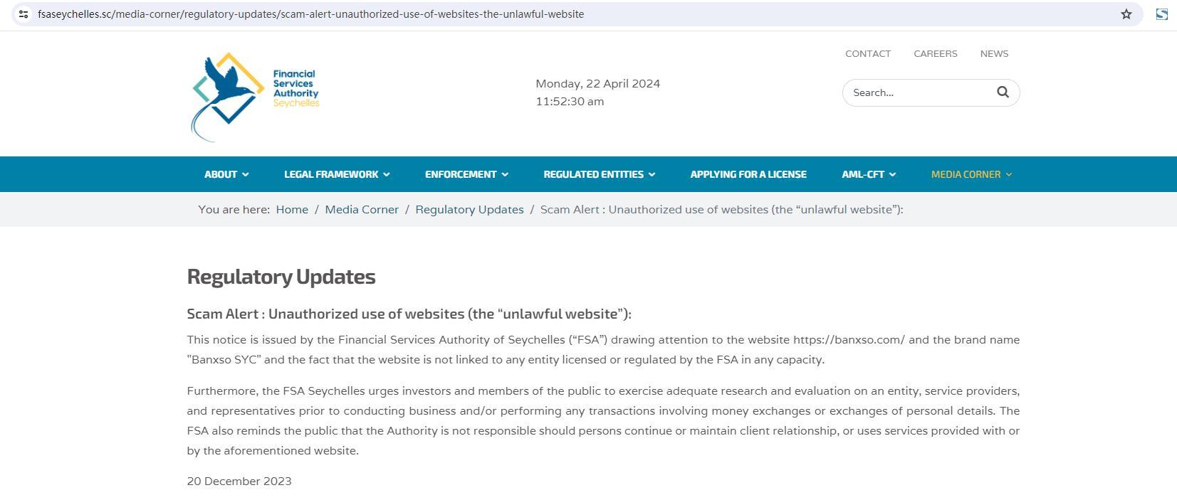 aggiornamenti normativi avviso truffa: uso non autorizzato di siti web (il “sito web illegale”): questo avviso viene emesso dall'autorità per i servizi finanziari delle seychelles (“fsa”) richiamando l'attenzione sul sito web https:// Banxso .com/ e il nome del marchio " Banxso syc" e il fatto che il sito web non è collegato ad alcuna entità autorizzata o regolamentata dalla fsa a qualsiasi titolo. Inoltre, la fsa seychelles esorta gli investitori e i membri del pubblico a esercitare un'adeguata ricerca e valutazione su un'entità, fornitori di servizi e rappresentanti prima di condurre affari e/o eseguire qualsiasi transazione che coinvolga scambi di denaro o scambi di dati personali, la fsa ricorda inoltre al pubblico che l'autorità non è responsabile nel caso in cui le persone continuino o mantengano una relazione con il cliente, o utilizzino i servizi forniti con o dal suddetto sito web. 20 dicembre 2023