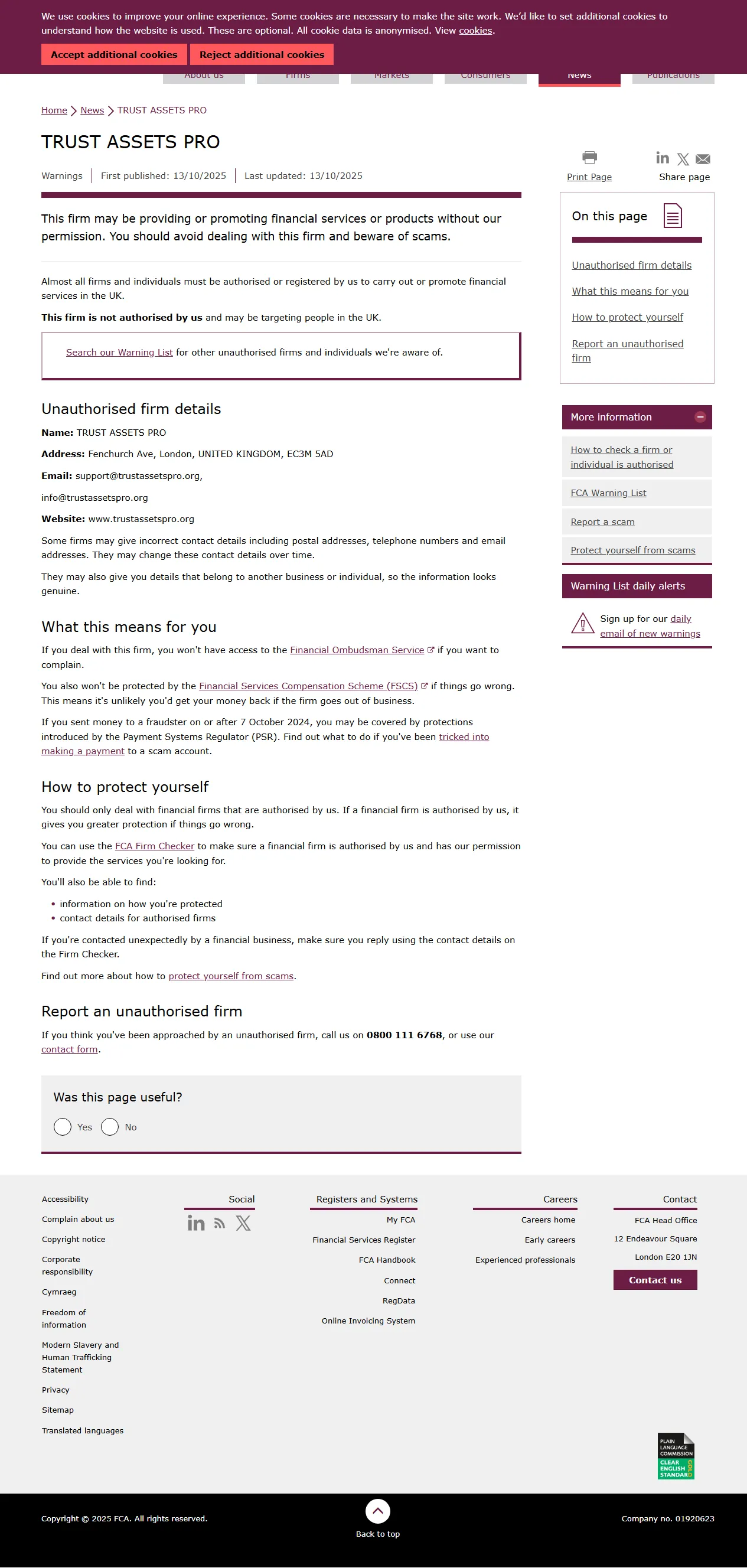 Questa società potrebbe offrire o promuovere servizi o prodotti finanziari senza la nostra autorizzazione. Dovresti evitare di trattare con questa società e stare attento alle truffe. Quasi tutte le società e le persone fisiche devono essere autorizzate o registrate da noi per svolgere o promuovere servizi finanziari nel Regno Unito. Questa società non è autorizzata da noi e potrebbe prendere di mira persone nel Regno Unito. Cerca nella nostra Lista di Avvisi altre società e persone fisiche non autorizzate di cui siamo a conoscenza. Dettagli della società non autorizzata Nome: TRUST ASSETS PRO Indirizzo: Fenchurch Ave, London, REGNO UNITO, EC3M 5AD Email: support@trustassetspro.org,info@trustassetspro.org Sito web: www.trustassetspro.org Alcune società potrebbero fornire dettagli di contatto errati, inclusi indirizzi postali, numeri di telefono e indirizzi email. Potrebbero modificare questi dettagli di contatto nel tempo. Potrebbero anche fornirti dettagli che appartengono a un'altra attività o persona fisica, in modo che le informazioni sembrino genuine..