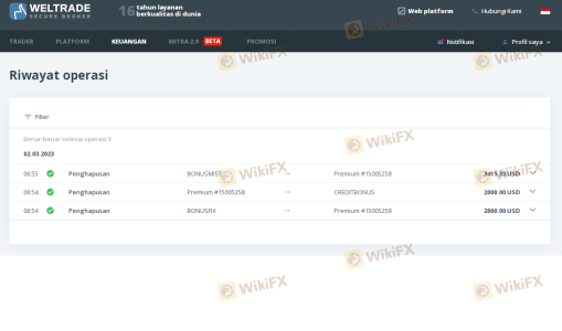 WELTRADEブローカーのウェブサイトプラットフォームを直ちにブロックしてください。このブローカーは、インドネシアから数十万人のクライアントを騙し、利益を支払わず、さまざまなプロモーションの名目でクライアントの預金資金を取ります。彼らは本当に私の利益を支払わず、$5190の金額を削除し、私の$950の預金を返金しません!このレビューを読むすべてのトレーダーに対して、詐欺ブローカーである"WELTRADE"から直ちに遠ざかるようお願いします。
