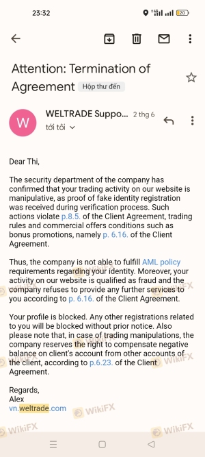 彼らは虚偽の広告を使って投資家を騙し、資金を預けさせた後、あらゆる手口で元本を搾取します。本当にひどい話です。私は最初、Weltradeの「ゼロスリッページ、低手数料」という言葉を信じていましたが、完全な詐欺でした。通常の市場状況でもスリッページが10ポイントを超えることがあり、手数料は約束の3倍です。カスタマーサービスに問い合わせると、「実際の取引によります」とだけ言われました。私の口座は理由もなく凍結され、資金は「死に金」になりました。カスタマーサービスの対応は最悪で、質問に答え終わらないうちに電話を切られました。後で規制当局に苦情を申し立てたとき、このプラットフォームのいわゆる「コンプライアンス規制」が偽物だと判明しました!このような無規制、無サポート、闇市場のプラットフォームは閉鎖されるべきです!