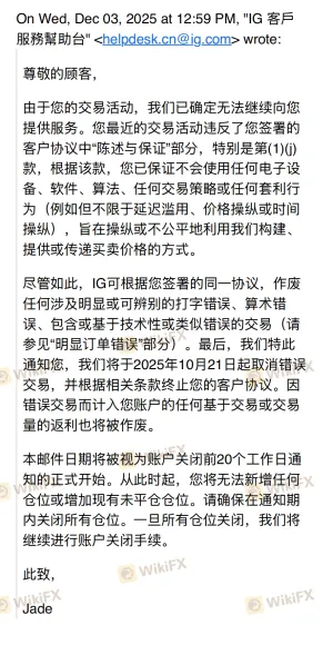 我在2025年8月29日注册成为IG Group的一名用户,并在几天后尝试入金交易。 虽然一开始产生了一些亏损,但我在交易和出入金方面一切顺利。直到2025年10月28日,我无法再使用我的任何交易账户进行交易,也无法从我的任何交易账户提取资金。当时,我的账户仍有108208.70美元。当我向IG Group客服部门表达疑问时,客服以合规部门审查为理由,让我耐心等待 我不认为我的账户有任何问题,而我也并未收到IG公司对我的询问,当然我愿意配合这些。但只是一味的在等待,我等待了一个月 2025年12月3日,我收到了以下邮件,相关部门扣除了我的账户资金高达271373.4美元(目前我的账户资金为-163164.7美元) 根据IG邮件表述,我违反了《客户协议》,且认定我的订单属于交易错误。他们在当天扣除了我自2025年10月21日起的交易盈利以及交易量返利 诉求:退还本人所有被扣除的资金,允许本人出金