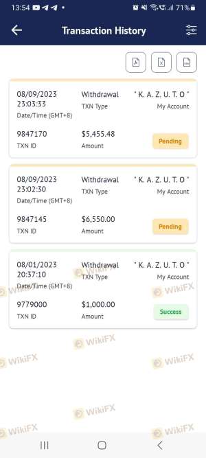2025年10月27日の最初の出金リクエストは、取引量不足(必要量の3倍未満)により拒否され、追加の証拠金預け入れを要求されました。2025年11月4日の2回目の出金リクエストは、マネーロンダリングを理由に拒否され、さらに5,000 USDTの証拠金預け入れが必要とされました。要するに、彼らは出金を許可せず、私のアカウントを凍結しました。私は合計22,987.5 USDTを投資しました。