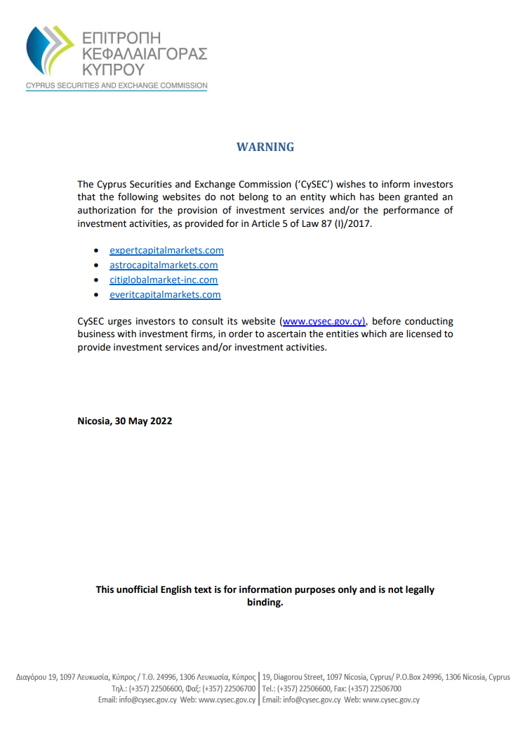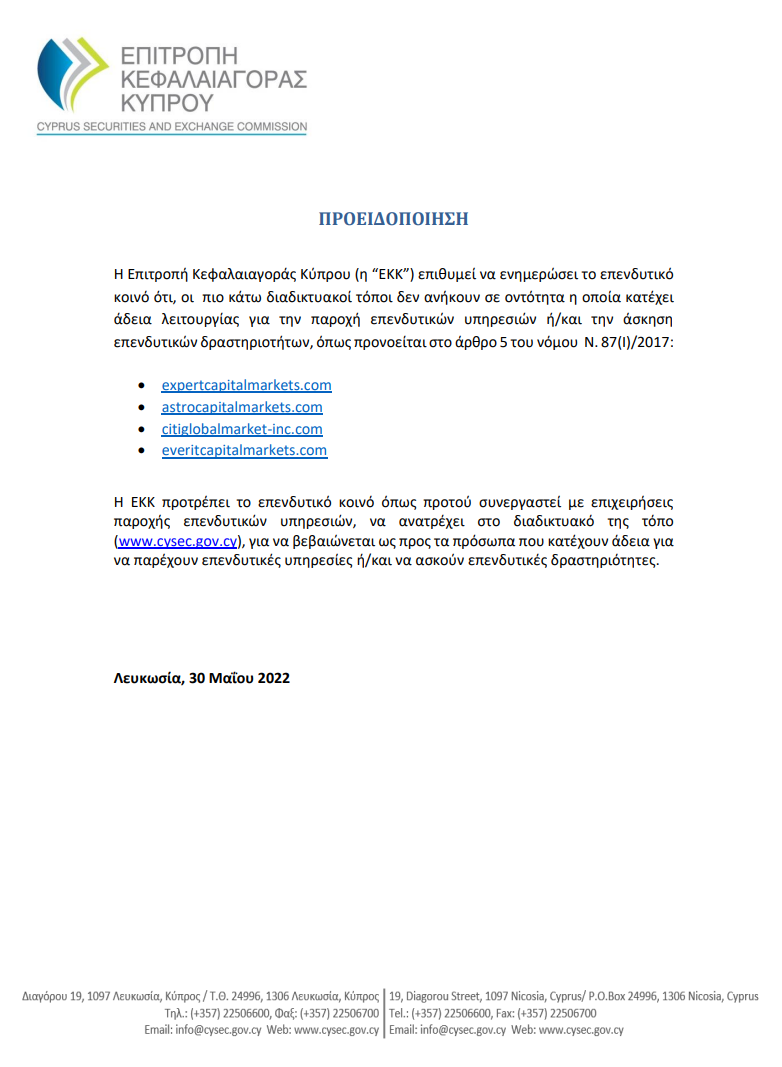 キプロス証券取引委員会(CySEC)は、2001年の証券取引委員会(設立と責任)法のセクション5に基づいて設立された公的法人です。 CySECは、投資サービス市場、キプロス共和国での有価証券取引、および集団投資および資産管理を監督する独立した公的規制機関です。また、ICPACおよびキプロス弁護士会によって規制されていない管理サービスを提供する企業を監督しています。
