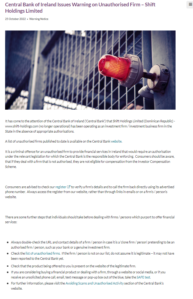 アイルランド中央銀行が無許可の会社に警告を発する – Shift Holdings Limited