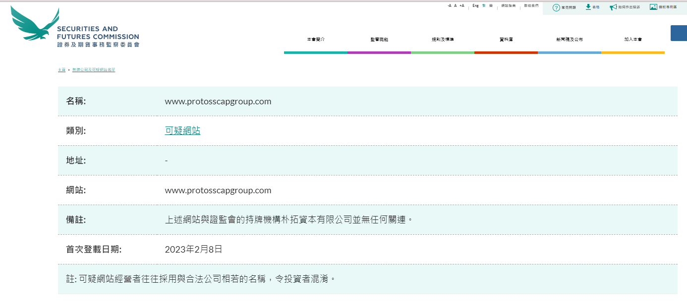 無認可企業および疑わしい Web サイトのリストには、香港で認可を受けておらず、証券先物委員会の注目を集めている企業がリストされています。これらの企業は、香港の投資家にマーケティングを行っている、または行っていた疑いがあるか、香港と関係があると主張しています。名前またはカテゴリで検索して、企業がリストにあるかどうかを確認できます。このリストは網羅的なものではありません。 SFC は注目すべき企業や Web サイトを見つけることが多いため、リストに新しい名前を随時追加しています。無認可の会社から連絡があった場合は、オンラインの苦情フォームをご利用ください。ボイラー室、詐欺 Web サイト、フィッシング メールの詳細については、関連するリンクをクリックしてください。注: 無認可の企業と疑わしい Web サイトのリストは、投資家に早期に警告することを目的としています。投資家は、上記のリストの情報だけに頼るのではなく、個々の企業の詳細を自分で注意深く確認する必要があります。各列のコンテンツ名の最初の英字を選択してリストを表示するか、「中国語名」列をクリックして中国語名のみの企業を参照してください。名前:www. PROTOSS capgroup.com カテゴリ: 不審な Web サイト アドレス: - Web サイト: www. PROTOSS capgroup.com 備考: 上記のウェブサイトは、SFC の認可機関である Captop Capital Limited とは関係ありません。最初の発行日: 2023 年 2 月 8 日 注: 疑わしい Web サイトの運営者は、正当な企業に似た名前を使用することが多く、投資家を混乱させています。