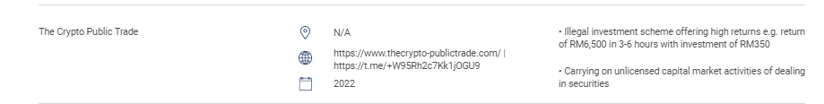 「このセクションには、無許可の Web サイト、投資商品、企業、個人のリストが含まれています。このリストには、SC からのライセンスを受けずに次の規制対象活動を実行している、または実行しているとしている人物が含まれます。資金管理、コーポレートファイナンスに関するアドバイス、投資アドバイス、財務計画、民間退職金制度の取り扱い 認可を受けずに承認された市場を運営する者 承認、許可、承認なしに有価証券を発行または提供する者 SC のロゴを悪用し、SC を虚偽表示する者「暗号通貨公取 該当なし https://www. thecrypto-publictrade.com / | https://t.me/+w95rh2c7kk1jogu9 2022年 • 高い収益をもたらす違法な投資スキーム(例:350リンギットの投資で3~6時間で6,500リンギットの収益) • 無許可の証券取引という資本市場活動の継続