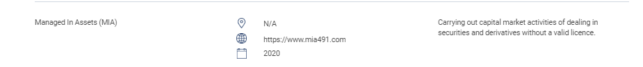 「このセクションには、無許可の Web サイト、投資商品、企業、個人のリストが含まれています。このリストには、SC からのライセンスを受けずに次の規制対象活動を実行している、または実行しているとしている人物が含まれます。資金管理、コーポレートファイナンスに関するアドバイス、投資アドバイス、財務計画、民間退職金制度の取り扱い 認可を受けずに承認された市場を運営する者 承認、許可、承認なしに有価証券を発行または提供する者 SC のロゴを悪用し、SC を虚偽表示する者" 資産で管理 ( MIA ) 該当なし https://www. MIA 491.com 2020 は、有効なライセンスを取得せずに有価証券やデリバティブを取引する資本市場活動を行っています。