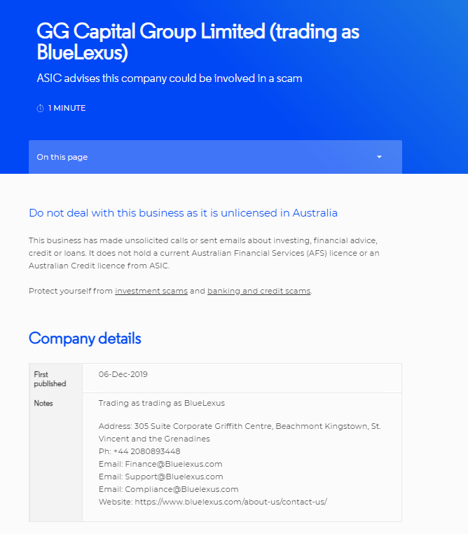 投資家向け警告リスト GG Capital Group Limited(BlueLexusとして取引) ASICはこの会社が詐欺に関与している可能性があると警告しています.