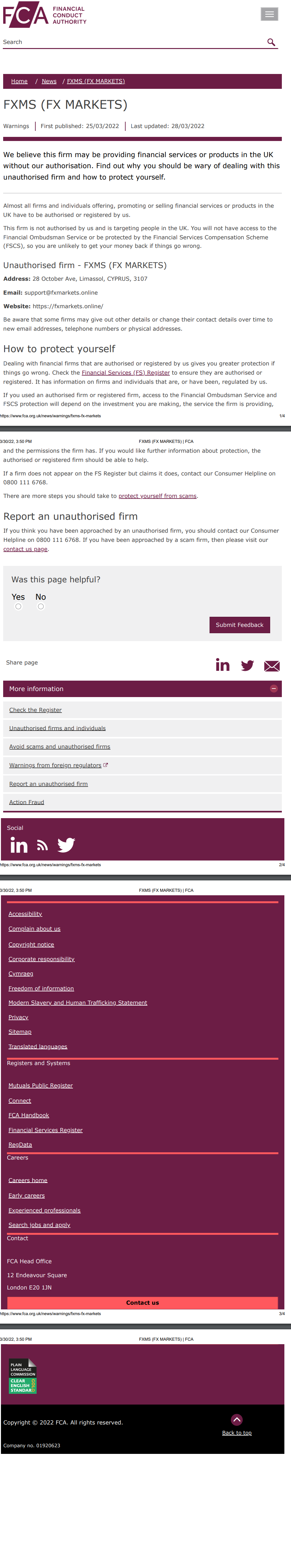 fxms ( FX Markets ) (https://fxmarkets.online/) 2022/03/30 イギリス fxms ( FX Markets ) この会社は英国で当社の許可なく金融サービスまたは商品を提供している可能性があると考えられます。この無許可の会社との取引に慎重になる必要がある理由と、自分自身を守る方法を確認してください。英国で金融サービスや商品を提供、宣伝、販売するほぼすべての企業や個人は、当社による認可または登録が必要です。この会社は当社の認可を受けておらず、英国内の人々をターゲットにしています。金融オンブズマンサービスにアクセスできず、金融サービス補償制度(fscs)による保護も受けられないため、問題が発生した場合にお金が戻ってくる可能性はほとんどありません。無許可の会社 - fxms ( FX Markets ) 住所: 28 october ave, limassol, cyprus, 3107 電子メール: support@fxmarkets.online ウェブサイト: https://fxmarkets.online/ 一部の企業は、他の詳細を公開したり、連絡先の詳細を時間の経過とともに新しい電子メール アドレスに変更したりする場合があることに注意してください。 、電話番号または住所。自分自身を守る方法 当社によって認可または登録されている金融会社と取引することで、問題が発生した場合に、より強力な保護が得られます。金融サービス (fs) 登録をチェックして、それらが認可または登録されていることを確認してください。当社によって規制されている、またはされていた企業や個人に関する情報が含まれています。認可された事務所または登録された事務所を利用した場合、金融オンブズマン サービスと fscs 保護へのアクセスは、行っている投資、事務所が提供しているサービス、および事務所が持つ許可によって異なります。保護についてさらに詳しい情報が必要な場合は、認定または登録された企業がお手伝いできるはずです。企業が登録簿に載っていないのに、登録していると主張する場合は、消費者ヘルプライン(0800 111 6768)にご連絡ください。詐欺から身を守るためには、さらに多くの手順を踏む必要があります。無許可の会社から連絡を受けたと思われる場合は、無許可の会社を報告してください。消費者ヘルプライン(0800 111 6768)にご連絡ください。詐欺会社から連絡を受けた場合は、お問い合わせページをご覧ください。