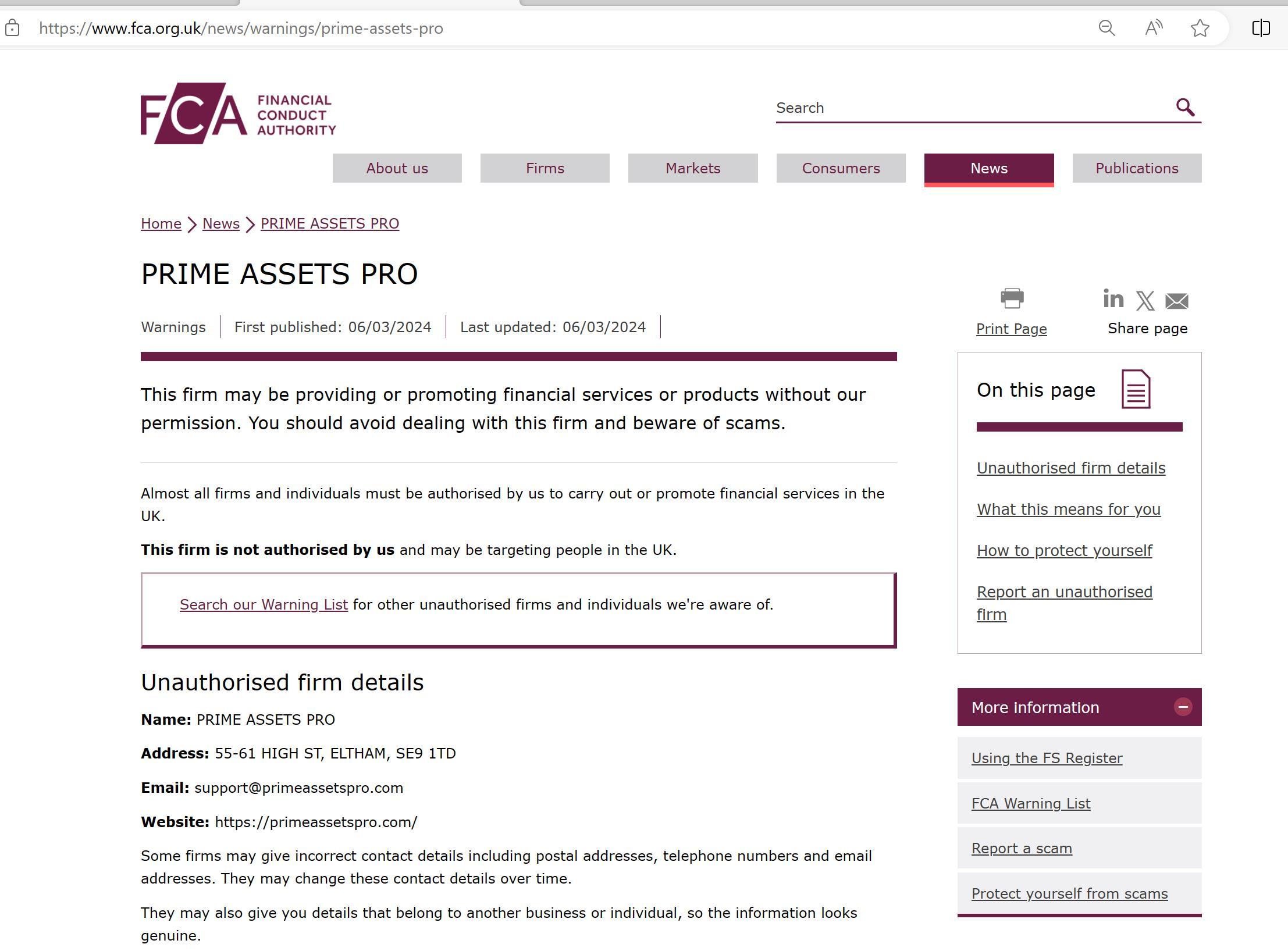 FCA警告リスト:無認可企業 PRIME ASSETS PRO.