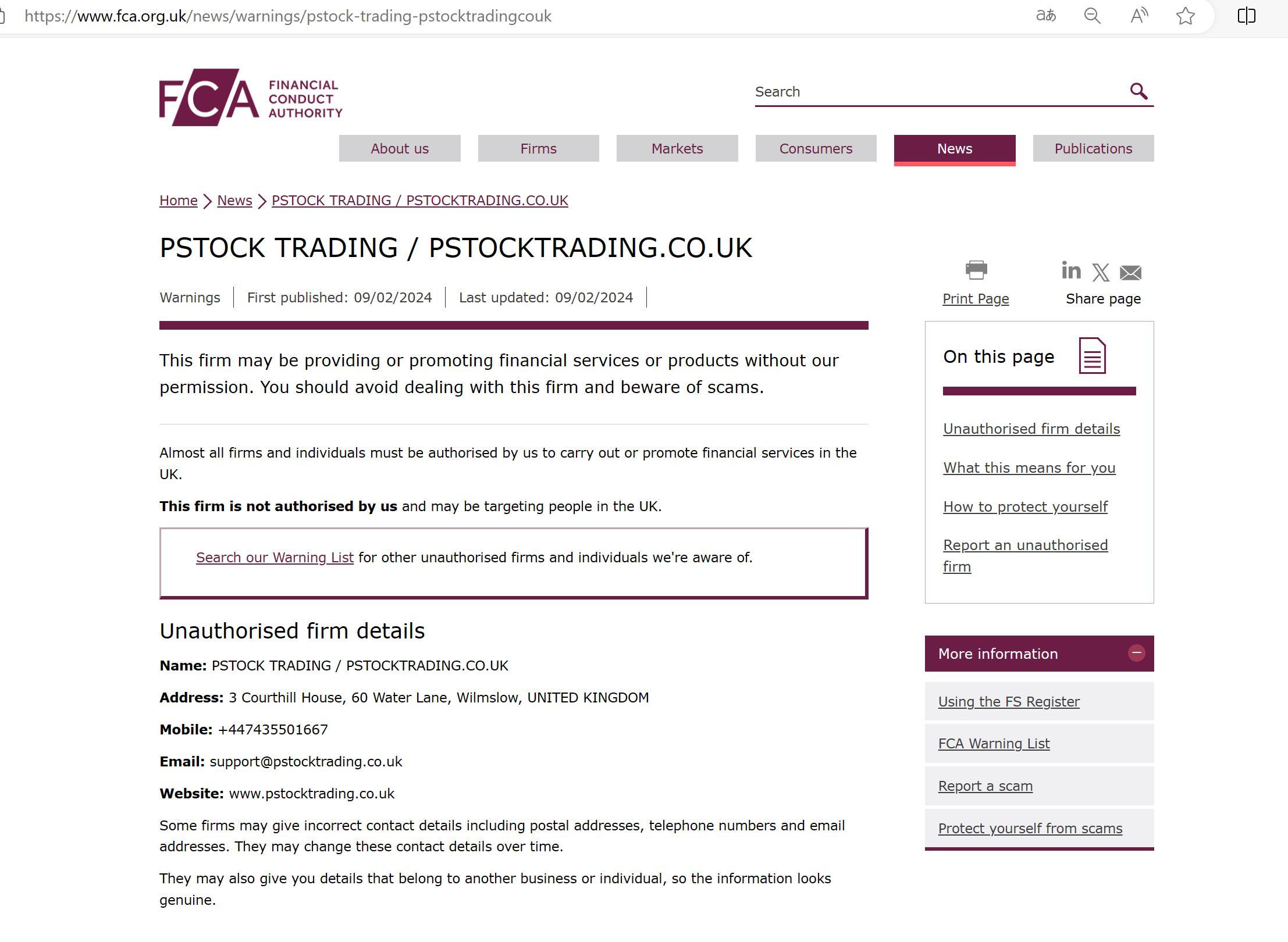 FCA無許可企業警告リスト PSTOCK TRADING / PSTOCKTRADING.CO.UK.