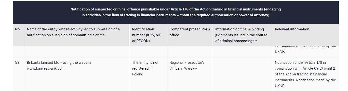 Brikanta Limited Ltd - ウェブサイト www.fxinvestbank.com を使用 この事業体は、金融商品取引に関する法律第 69 条第 2 項第 2 項に関連する第 178 条に基づくワルシャワ通知のポーランド地方検察局に登録されていません。 UKNFによる通知。