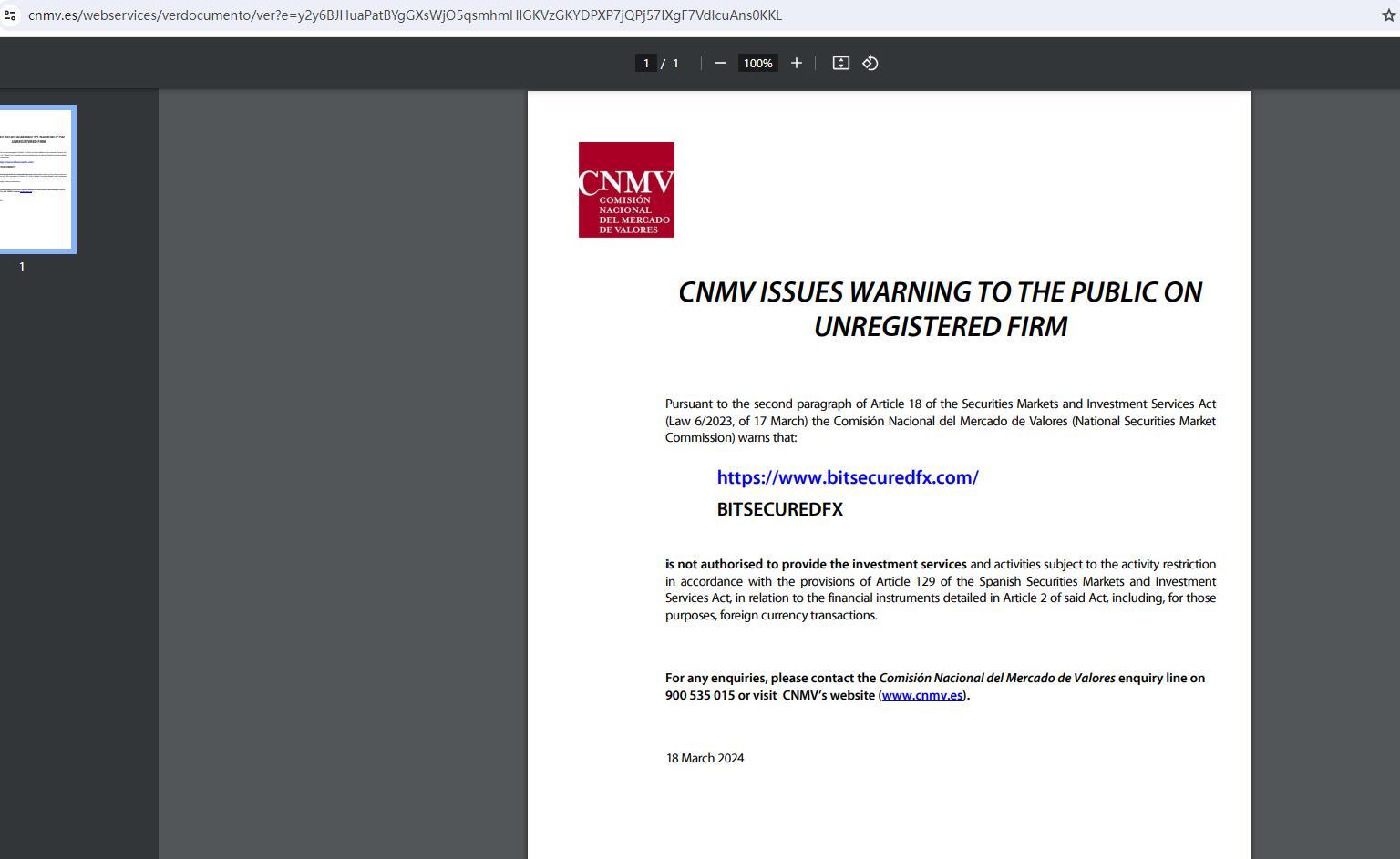 CNMV は、証券市場および投資サービス法 (法律 6/2023、3 月 17 日) 第 18 条第 2 項に基づき、未登録企業に関して一般市民に警告を発します。Comisión Nacional del Mercado de Valores (国家証券市場委員会) は、次のように警告します。https://www. bitsecuredfx .com/ bitsecuredfxスペイン証券市場および投資サービス法第 129 条の規定に従って活動制限の対象となる投資サービスおよび活動を提供する権限は、同法第 2 条に詳述されている金融商品(これらの目的では外貨取引を含む)に関して付与されていません。お問い合わせは、スペイン証券市場および投資サービス法委員会の問い合わせライン 900 535 015 までご連絡いただくか、CNMV の Web サイト (www.cnmv.es) をご覧ください。2024 年 3 月 18 日