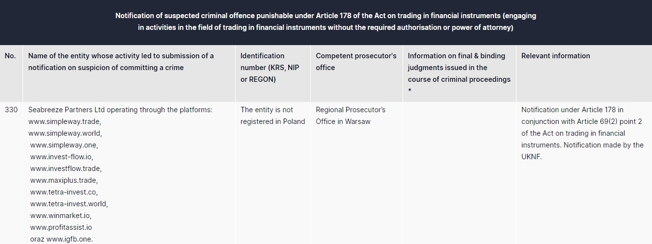 Seabreeze Partners Ltd以下のプラットフォームを通じて運営されています: www.simpleway.trade、www.simpleway.world、www.simpleway.one、www.invest-flow.io、www.investflow.trade、www。 MaxiPlus .trade、www.tetra-invest.co、www.tetra-invest.world、www. WinMarket .io、www.profitassist.io、または www.igfb.one。この組織はポーランドのワルシャワ地方検察庁に登録されていません。金融商品取引法第 69(2) 条第 2 項と併せて第 178 条に基づく通知。UKNF による通知。