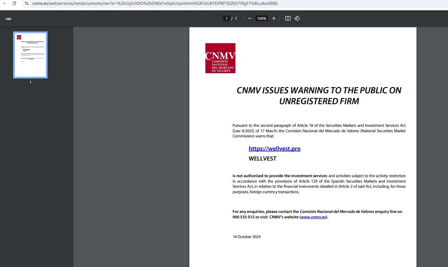 CNMV は、証券市場および投資サービス法 (法律 6/2023、3 月 17 日) 第 18 条第 2 項に基づき、未登録企業に関する一般への警告を発行します。Comisión Nacional del Mercado de Valores (国家証券市場委員会) は、次のことを警告します。https:// Wellvest .プロ Wellvestスペイン証券市場および投資サービス法第 129 条の規定に従って活動制限の対象となる投資サービスおよび活動を提供する権限は、同法第 2 条に詳述されている金融商品(これらの目的では外貨取引を含む)に関して付与されていません。お問い合わせは、スペイン証券市場および投資サービス法委員会の問い合わせライン 900 535 015 までご連絡いただくか、CNMV の Web サイト (www.cnmv.es) をご覧ください。2024 年 10 月 14 日