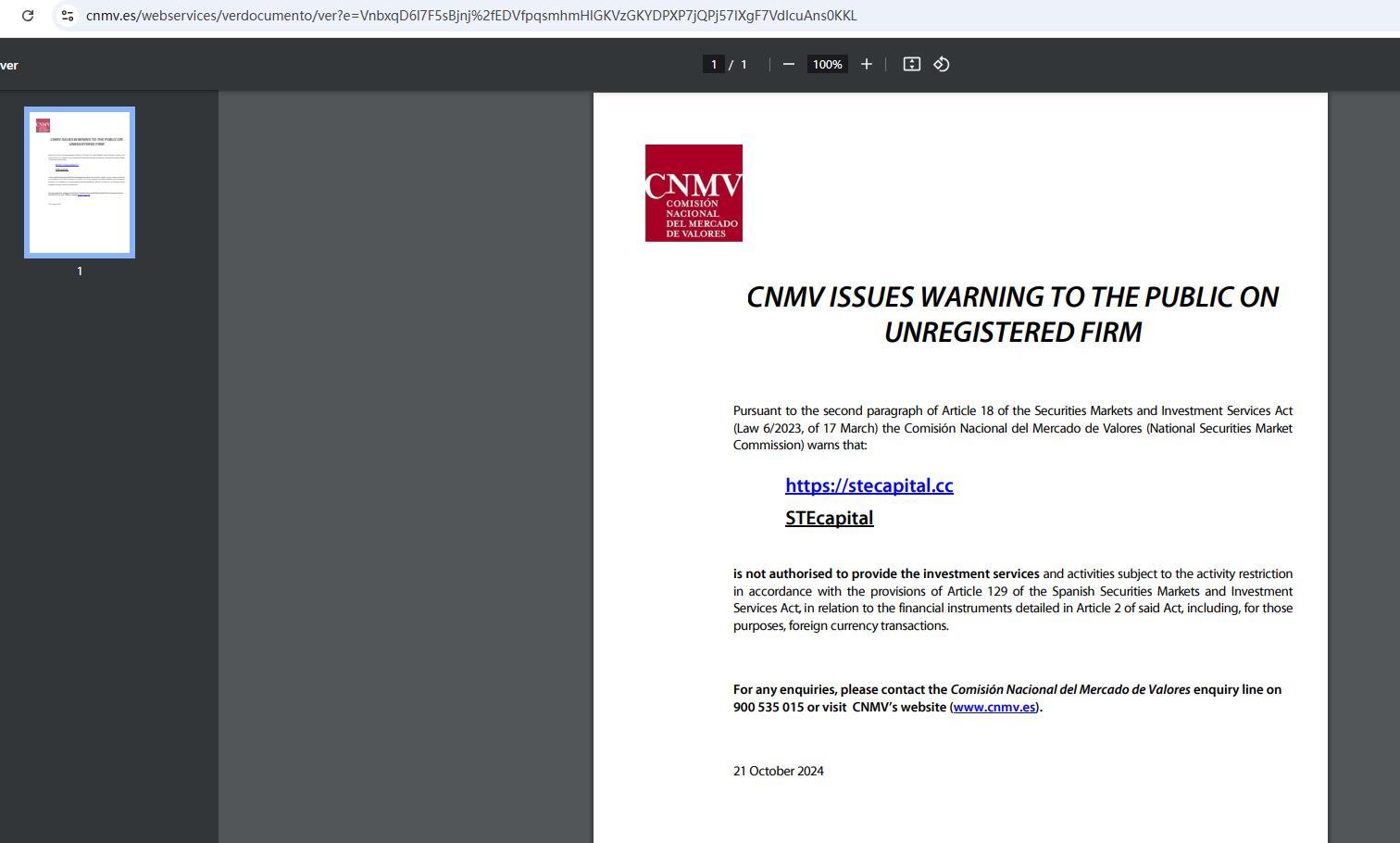 CNMV は、証券市場および投資サービス法 (法律 6/2023、3 月 17 日) 第 18 条第 2 項に基づき、未登録企業に関する一般への警告を発行します。Comisión Nacional del Mercado de Valores (国家証券市場委員会) は、次のことを警告します。https:// STEcapital .cc STEcapitalスペイン証券市場および投資サービス法第 129 条の規定に従って活動制限の対象となる投資サービスおよび活動を提供する権限は、同法第 2 条に詳述されている金融商品(これらの目的では外貨取引を含む)に関して付与されていません。お問い合わせは、スペイン証券市場および投資サービス法委員会の問い合わせライン 900 535 015 までご連絡いただくか、CNMV の Web サイト (www.cnmv.es) をご覧ください。2024 年 10 月 21 日