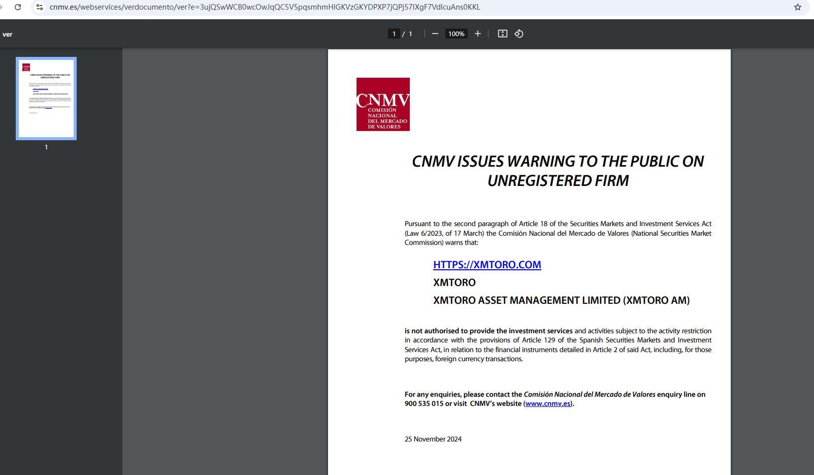 CNMV は、証券市場および投資サービス法 (法律 6/2023、3 月 17 日) 第 18 条第 2 項に基づき、未登録企業に関する一般への警告を発行します。Comisión Nacional del Mercado de Valores (国家証券市場委員会) は、次のことを警告します。https:// XMTORO .com XMTORO XMTOROアセットマネジメント株式会社( XMTORO am) は、スペイン証券市場および投資サービス法第 129 条の規定に従って活動制限の対象となる投資サービスおよび活動を提供する権限を付与されていません。この活動は、同法第 2 条に詳述されている金融商品に関連しており、その目的のために外国為替取引も含まれます。お問い合わせは、comisión nacional del mercado de valores 問い合わせライン 900 535 015 までご連絡いただくか、CNMV の Web サイト (www.cnmv.es) をご覧ください。2024 年 11 月 25 日
