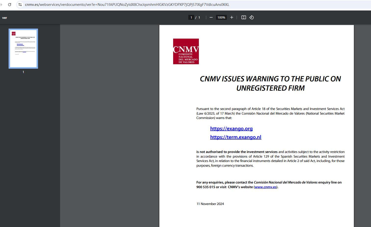 CNMV は、証券市場および投資サービス法 (法律 6/2023、3 月 17 日) 第 18 条第 2 項に基づき、未登録企業に関する一般への警告を発行します。Comisión Nacional del Mercado de Valores (国家証券市場委員会) は、次のことを警告します。https:// Exango .org/https://term. Exango .nl/ は、スペイン証券市場および投資サービス法第 129 条の規定に従って活動制限の対象となる投資サービスおよび活動を、同法第 2 条に詳述されている金融商品(これらの目的では外貨取引を含む)に関して提供することを許可されていません。お問い合わせについては、comisión nacional del mercado de valores の問い合わせライン 900 535 015 にご連絡いただくか、CNM の Web サイト (www.cnmv.es) をご覧ください。2024 年 11 月 11 日