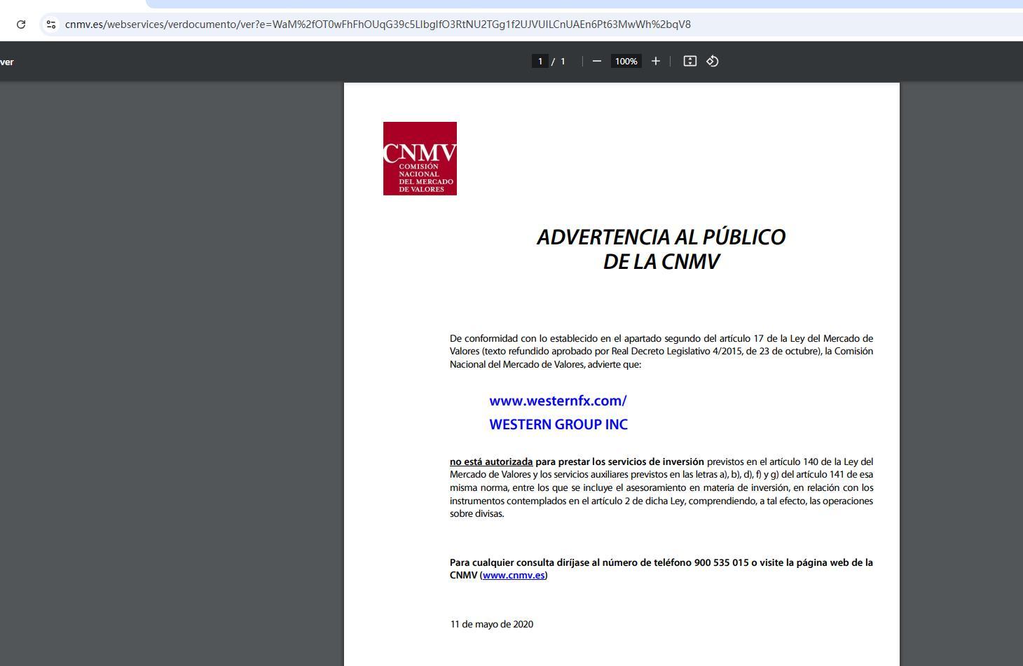 証券市場法第 17 条第 2 項の規定 (2015 年 10 月 23 日の王立立法令 4/2015 により承認された統合テキスト) に従い、CNMV から国民への警告として、国家証券市場委員会は次のことを警告します。www. WesternFX .com/ Western Group Inc当社は、証券市場法第 140 条に規定する投資サービス、および同法第 141 条の a)、b)、d)、f)、g) に規定する補助サービス (投資アドバイスを含む) を、同法第 2 条に規定する手段 (この目的では通貨取引を含む) に関して提供することは許可されていません。ご質問は、900 535 015までお電話いただくか、CNMVのウェブサイト(www.cnmv.es)をご覧ください。2020年5月11日