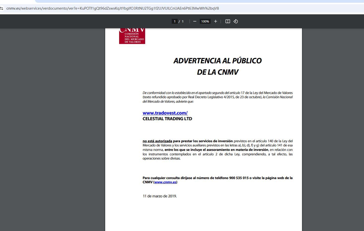 証券市場法第 17 条第 2 項の規定 (2015 年 10 月 23 日の王立立法令 4/2015 により承認された統合テキスト) に従い、CNMV から国民への警告として、国家証券市場委員会は次のことを警告します。www. Tradovest .com/celestial trading ltd は、証券市場法第 140 条に規定される投資サービス、および同法第 141 条の a)、b)、d)、f)、g) に規定される補助サービス (投資アドバイスを含む) を、同法第 2 条で想定される手段 (この目的では通貨取引を含む) に関して提供する権限を有しません。ご質問がある場合は、900 535 015 までお電話いただくか、2019 年 3 月 11 日までに CNMV の Web サイト (www.cnmv.es) をご覧ください。