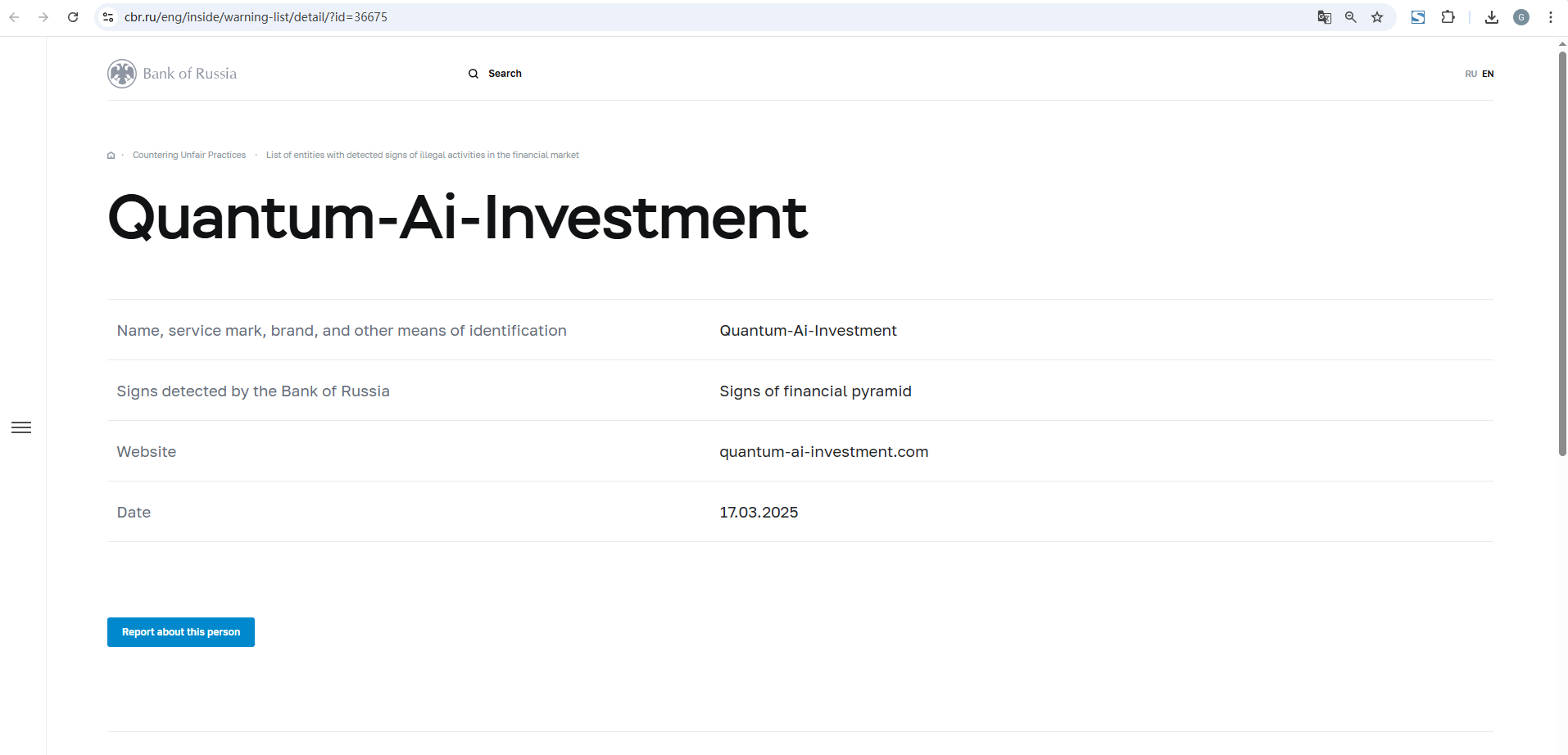 名前、サービスマーク、ブランド、その他の識別手段 Quantum-Ai-Investmentロシア銀行が検出した兆候 金融ピラミッドの兆候 ウェブサイト Quantum-Ai-Investment.com 日付 2025年3月17日