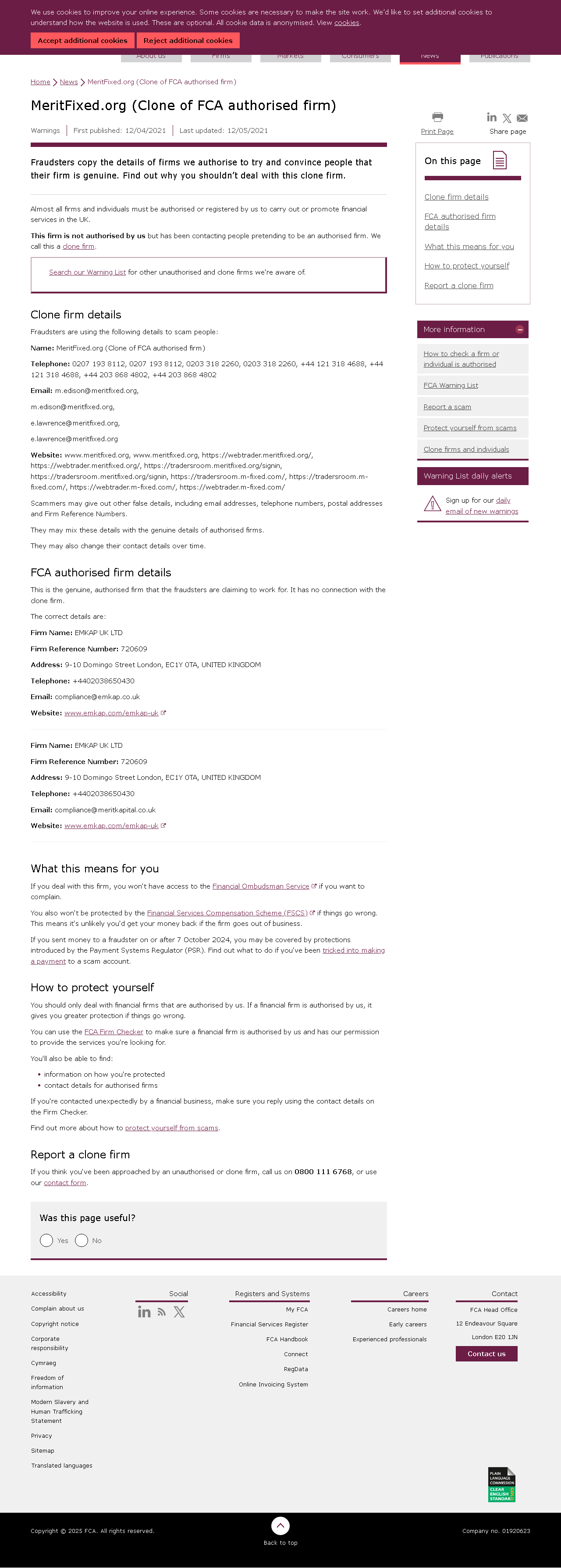 FCAの無許可企業警告リスト MeritFixed.org(FCA認可企業のクローン).