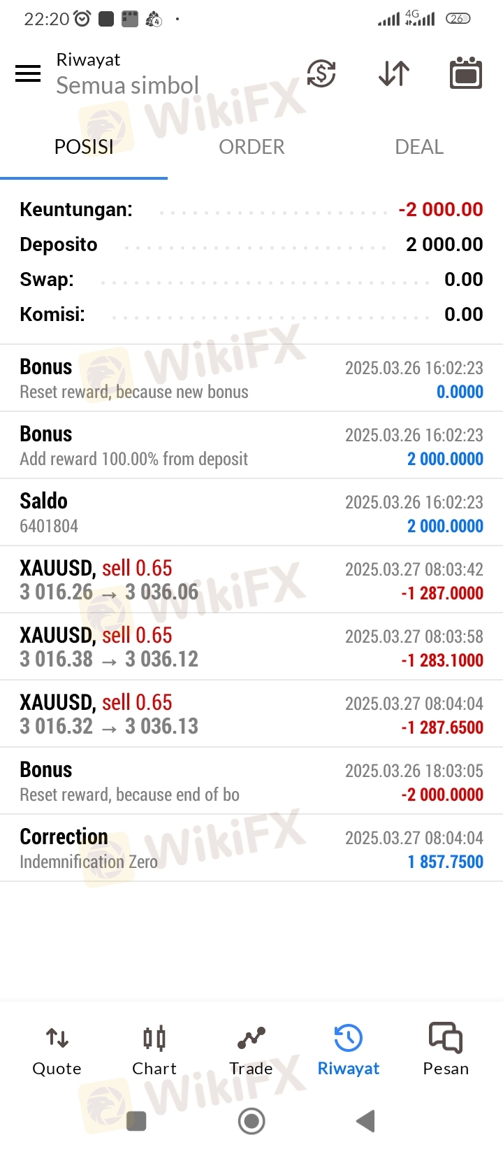 Awalnya mereka menawarkan bonus deposit 100%. setelah mendapatkan bonus, keanehan mulai terjadi. ketika sedang Trading tiba-tiba bonus ditarik dan beberpa saat kemudian akun saya terkena Floating minus. Saat saya ingin menutup posisi tidak bisa. Sampai floating minus semakin parah dan saldo saya semua habis menjadi nol. saya sudah hubungi CS mengenai masalah ini dan dia berkata ada pemeriksaan rutin akhir bulan, transaksi apapun tidak akan berpengaruh dan saldo akan dikembalikan penuh pada nilai semula deposit. Saya menghubungi setiap hari lewat email namun balasan nya selalu sama hanya disuruh menunggu tanpa ada kepastian. sekarang sudah 14 hari lebih, uang saya belum di kembalikan.!!