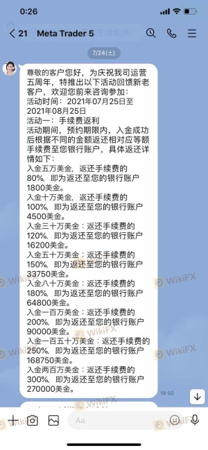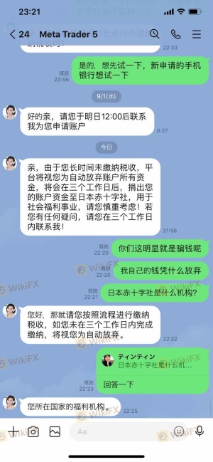 私はに投資しましたSunton Capital7月12日に友人の紹介でMT5に45万円を預けました。 7月24日、ボーナスを得るために18万円のデポジットをお願いしてくれました。プラットフォームが違法であることがわかり、撤回したいと思いました。彼らは私の申請を承認せず、その顧客サービスは返答しませんでした。 8月2日、15日後に600ロットを提供するように頼まれました。 8月16日、税金を払わなければならないと言われたか、アカウントがブロックされました。会話の歴史は以下の通り。