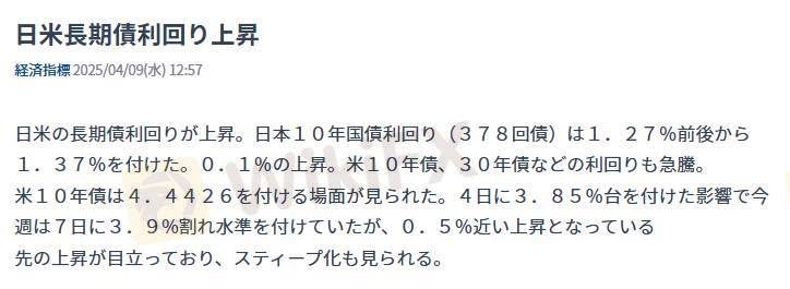 米10年債は4.4426を付ける場面が見られた。4日に3.85%台を付けた影響で今週は7日に3.9%割れ水準を付けていたが、0.5%近い上昇となっている