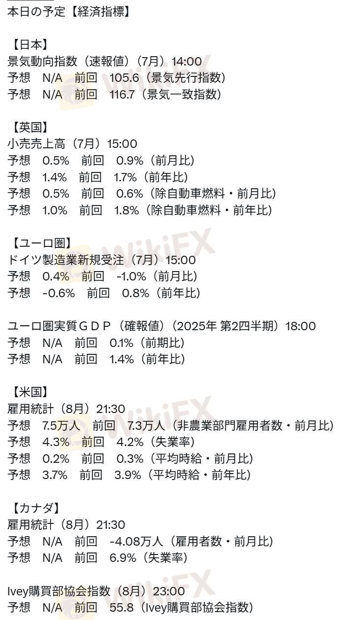 【日本】景気動向指数(速報値)(7月)14:00予想 N/A 前回 105.6(景気先行指数)予想 N/A 前回 116.7(景気一致指数)【英国】小売売上高(7月)15:00予想 0.5% 前回 0.9%(前月比) 予想 1.4% 前回 1.7%(前年比)予想 0.5% 前回 0.6%(除自動車燃料・前月比)予想 1.0% 前回 1.8%(除自動車燃料・前年比)【ユーロ圏】ドイツ製造業新規受注(7月)15:00予想 0.4% 前回 -1.0%(前月比) 予想 -0.6% 前回 0.8%(前年比)ユーロ圏実質GDP(確報値)(2025年 第2四半期)18:00予想 N/A 前回 0.1%(前期比)予想 N/A 前回 1.4%(前年比)【米国】雇用統計(8月)21:30 予想 7.5万人 前回 7.3万人(非農業部門雇用者数・前月比) 予想 4.3% 前回 4.2%(失業率)予想 0.2% 前回 0.3%(平均時給・前月比)予想 3.7% 前回 3.9%(平均時給・前年比)【カナダ】雇用統計(8月)21:30予想 N/A 前回 -4.08万人(雇用者数・前月比)予想 N/A 前回 6.9%(失業率)Ivey購買部協会指数(8月)23:00予想 N/A 前回 55.8(Ivey購買部協会指数)