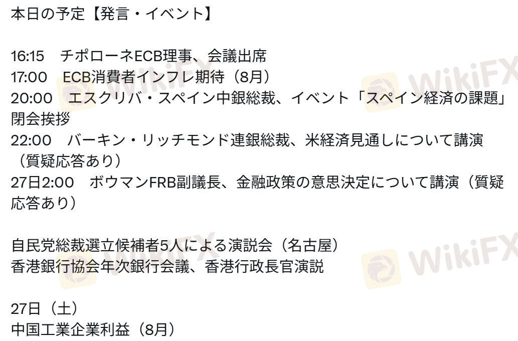 16:15 チポローネECB理事、会議出席17:00 ECB消費者インフレ期待(8月)20:00 エスクリバ・スペイン中銀総裁、イベント「スペイン経済の課題」閉会挨拶22:00 バーキン・リッチモンド連銀総裁、米経済見通しについて講演(質疑応答あり)27日2:00 ボウマンFRB副議長、金融政策の意思決定について講演(質疑応答あり)自民党総裁選立候補者5人による演説会(名古屋)香港銀行協会年次銀行会議、香港行政長官演説27日(土)中国工業企業利益(8月)