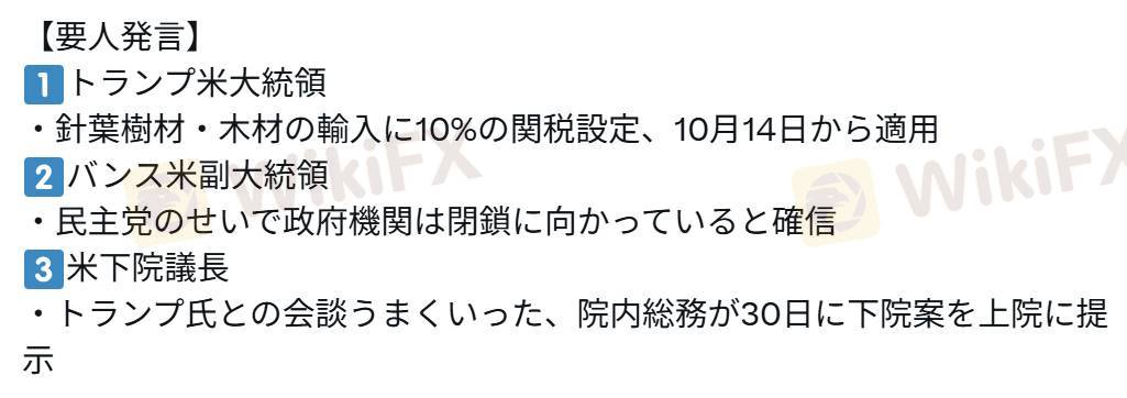 1⃣トランプ米大統領 ・針葉樹材・木材の輸入に10%の関税設定、10月14日から適用2⃣バンス米副大統領 ・民主党のせいで政府機関は閉鎖に向かっていると確信3⃣米下院議長 ・トランプ氏との会談うまくいった、院内総務が30日に下院案を上院に提示