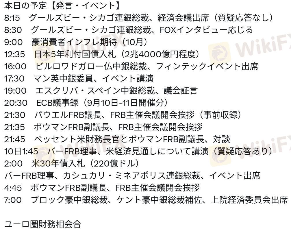 8:15 グールズビー・シカゴ連銀総裁、経済会議出席(質疑応答なし)8:30 グールズビー・シカゴ連銀総裁、FOXインタビュー応じる9:00 豪消費者インフレ期待(10月)12:35 日本5年利付国債入札(2兆4000億円程度)16:00 ビルロワドガロー仏中銀総裁、フィンテックイベント出席17:30 マン英中銀委員、イベント講演19:00 エスクリバ・スペイン中銀総裁、議会証言20:30 ECB議事録(9月10日-11日開催分)21:30 パウエルFRB議長、FRB主催会議開会挨拶(事前収録)21:35 ボウマンFRB副議長、FRB主催会議開会挨拶21:45 ベッセント米財務長官とボウマンFRB副議長、対談10日1:45 バーFRB理事、米経済見通しについて講演(質疑応答あり)2:00 米30年債入札(220億ドル)バーFRB理事、カシュカリ・ミネアポリス連銀総裁、イベント出席4:45 ボウマンFRB副議長、FRB主催会議閉会挨拶7:00 ブロック豪中銀総裁、ケント豪中銀総裁補佐、上院経済委員会出席ユーロ圏財務相会合