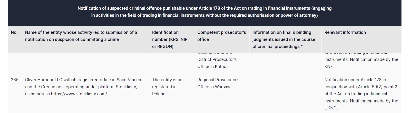 オリバーハーバーLLCはセントビンセントおよびグレナディーン諸島に登録事務所を構え、プラットフォームの下で運営されています。 Stocklinity 、アドレス https://www. を使用します。 Stocklinity .com/ 当該団体はポーランドのワルシャワ地方検察庁に登録されていません。金融商品取引法第 69(2) 条第 2 項と併せて第 178 条に基づく通知。UKNF による通知。