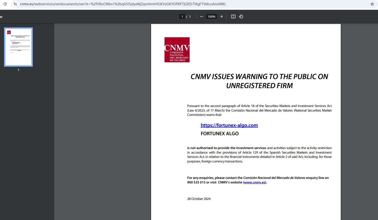 CNMV は、証券市場および投資サービス法(法律 6/2023、3 月 17 日)第 18 条第 2 項に基づき、未登録企業に関する一般への警告を発行します。Comisión Nacional del Mercado de Valores(国家証券市場委員会)は、次のように警告しています。https://fortunex-algo.com Fortunex Algoスペイン証券市場および投資サービス法第 129 条の規定に従って活動制限の対象となる投資サービスおよび活動を提供する権限は、同法第 2 条に詳述されている金融商品(これらの目的では外貨取引を含む)に関して付与されていません。お問い合わせは、スペイン証券市場および投資サービス法委員会の問い合わせライン 900 535 015 までご連絡いただくか、CNMV の Web サイト (www.cnmv.es) をご覧ください。2024 年 10 月 28 日