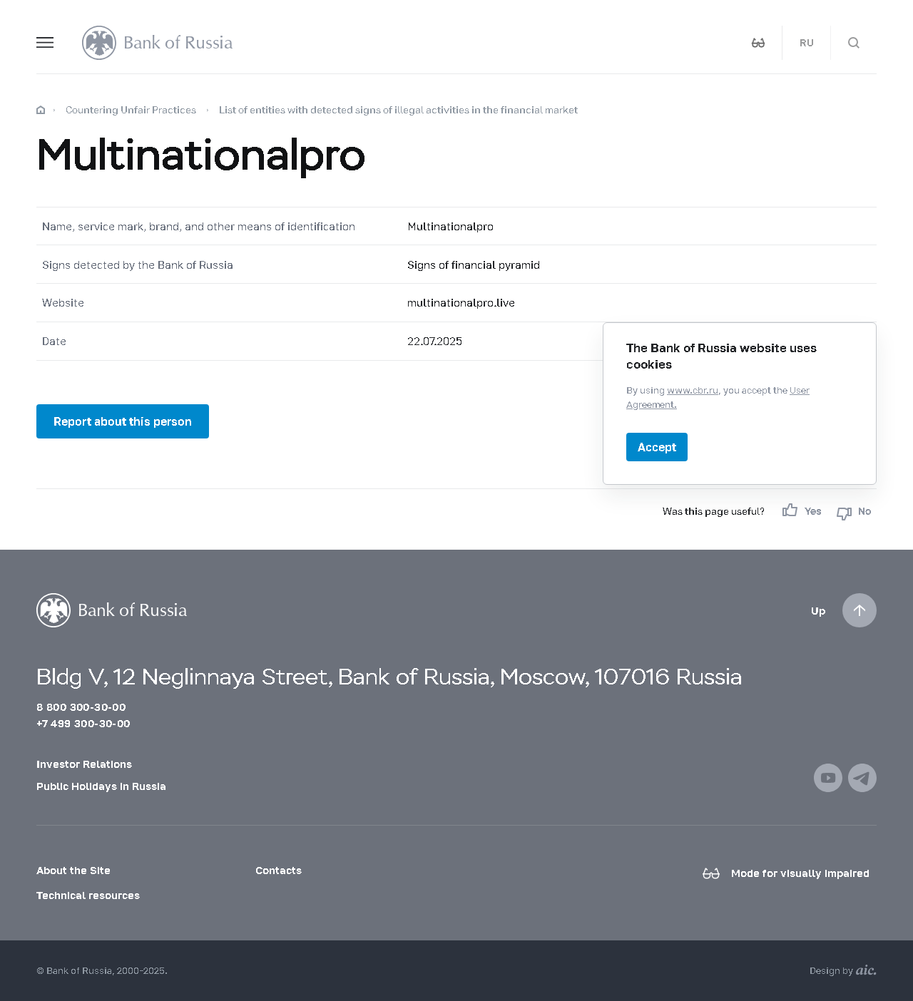 名称、サービスマーク、ブランド、その他の識別手段 Multinationalpro ロシア中央銀行が検出した兆候 金融ピラミッドの兆候 ウェブサイト multinationalpro.live 日付 22.07.2025.