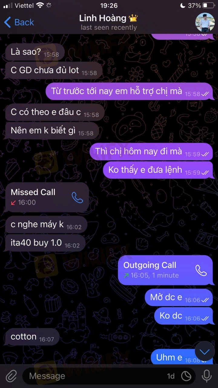 Tôi có mã ID 999370 tại sàn GTMX, theo nhóm sàn của Keily; tham gia được 1 tháng nhưng chỉ giao dịch cổ phiếu . sau 1 tháng tham gia tôi muốn gia hạn thêm bonus nhưng bạn hỗ trợ bảo tôi giao dịch chưa đủ lót . phải đi theo lệnh bạn hỗ trợ mới được gia hạn thêm Bonus. bạn hỗ trợ tôi là Hoàng Linh bên Telegram. ngày 2/10/ 2024. bạn hỗ trợ cho tôi đi lệnh Ita40; buy 1.0; nhưng tôi vào lệnh không được ; bạn đấy tiếp tục bảo tôi đi lệnh COTTON buy 1.0. tôi hỏi cổ phiếu à. bẠn ấy bảo “ Vâng”; bảo tôi mua 1 cổ để đủ lót gia hạn thêm bonus. Tôi vào lệnh bay luôn Tk 8150$. Tôi liên lạc bạn đấy không được, hỏi trưởng nhóm thì không trả lời, phó nhóm thì bảo liên hệ lại với bạn hỗ trợ mà cũng mất tích luôn. liên hệ Hotline, Mail sàn cũng không được.