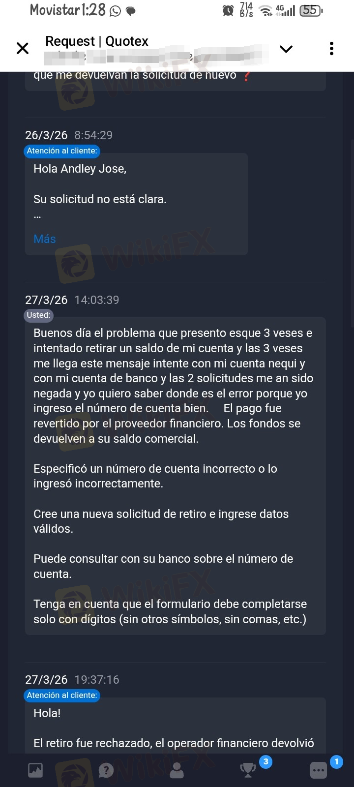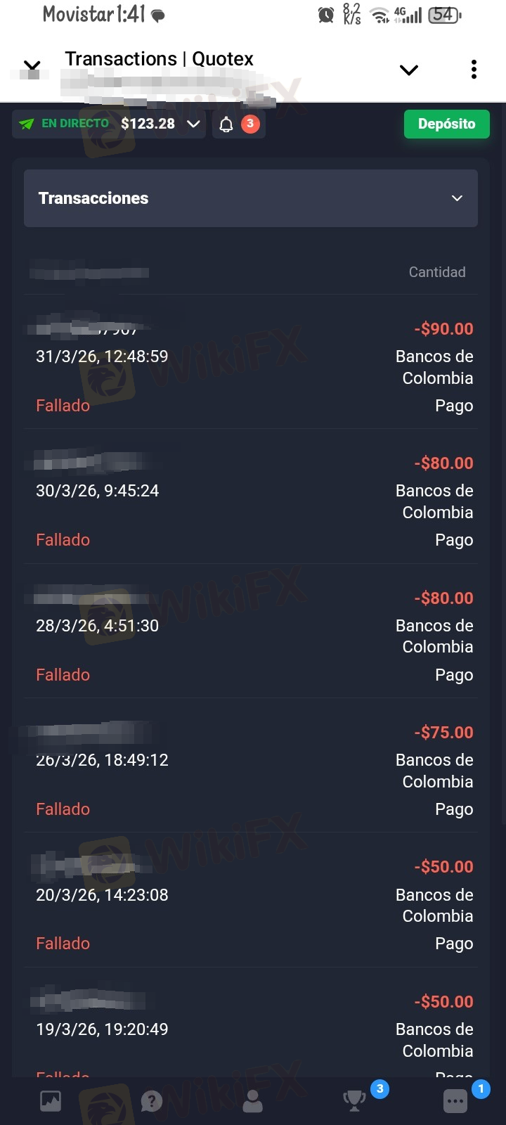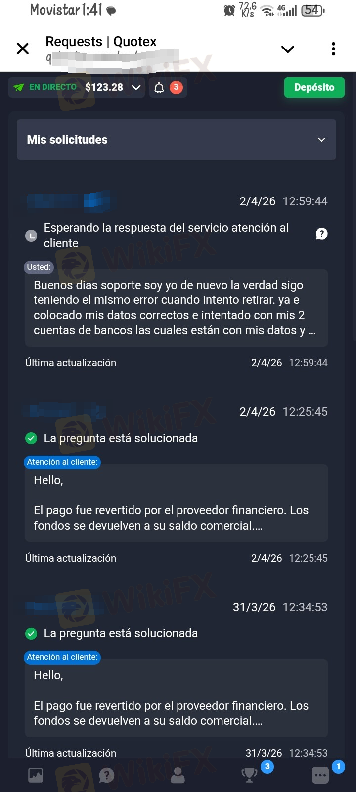 사용 가능한 모든 보고서를 Quotex 플랫폼을 통해 2개의 5초짜리 거래가 내가 모르게 모든 자본으로 플랫폼을 통해 실행되었기 때문에 플랫폼을 닫을 때 내 장치에서 플랫폼을 열었을 때 계정 잔액이 0이 된 것을 보았습니다. 플랫폼, 나는 136 달러의 자본을 회수하고 싶습니다. 이것은 내 자본으로 플랫폼의 사기를 나타냅니다. 플랫폼의 사기를 나타내는 일부 파일을 첨부하겠습니다.