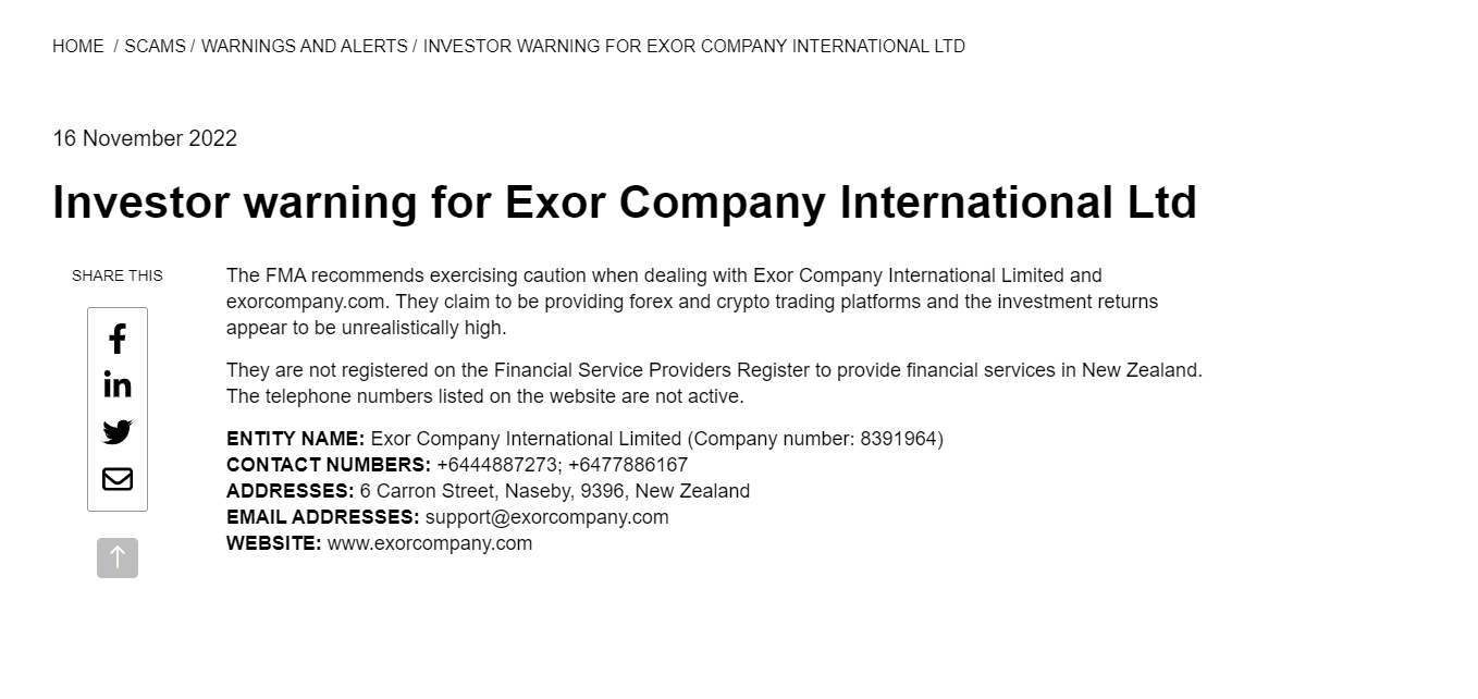 Exor Company International Ltd에 대한 투자자 경고