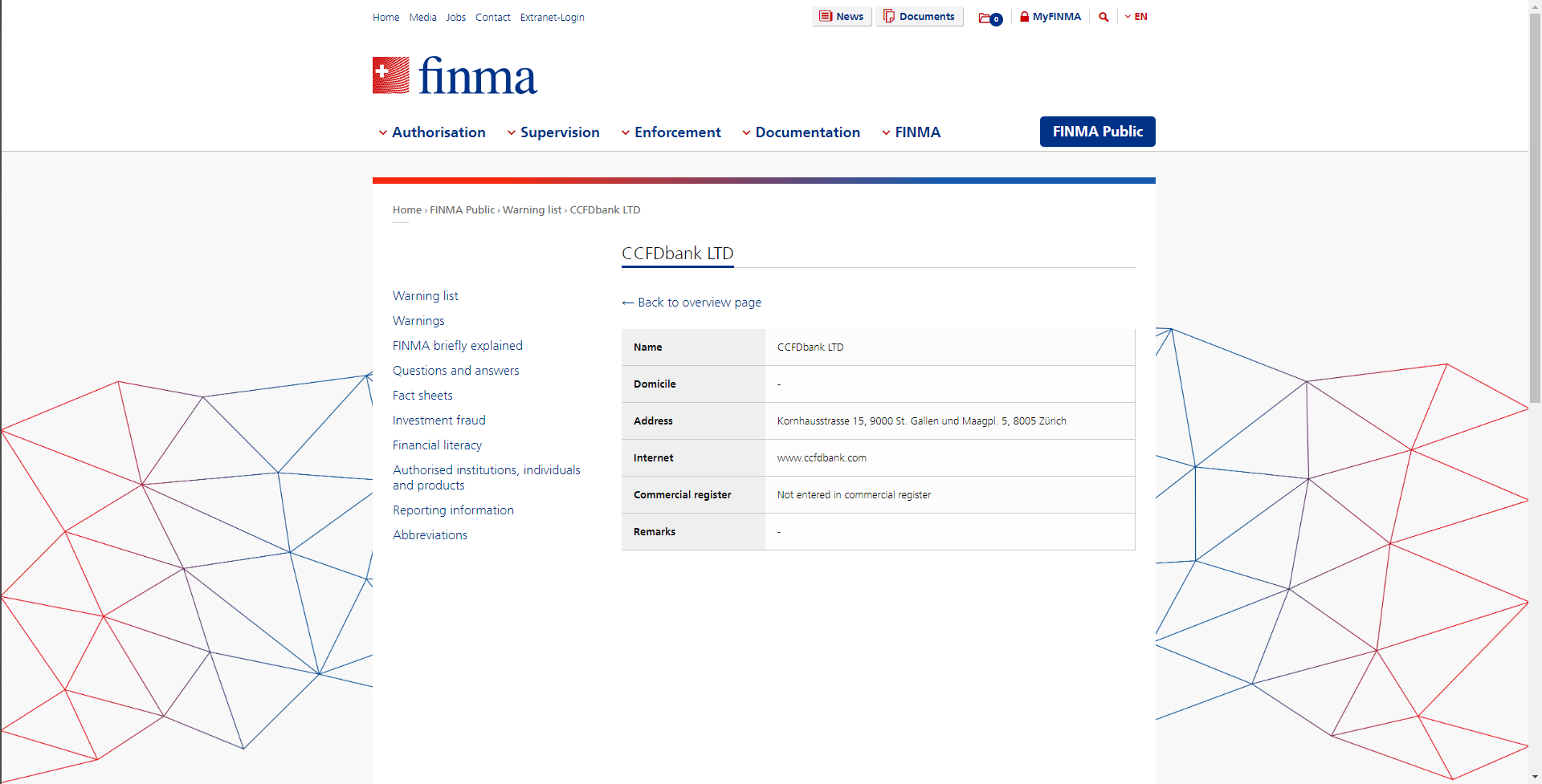 CCFDbank LTD이름 CCFDbank LTD 거주지 - 주소 kornhausstrasse 15, 9000 st. 갈렌과 마그플. 5, 8005 취리히 인터넷 www. CCFDbank .com 상업 등기부에 상업 등기부가 기재되어 있지 않음 비고 -
