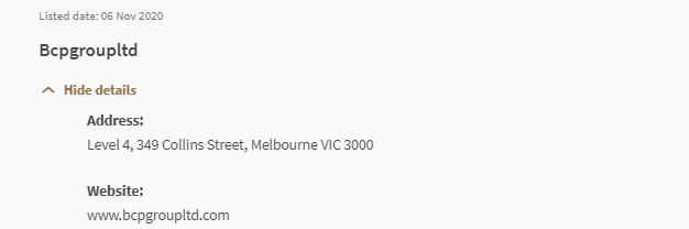 "투자자 경고 목록 투자자 경고 목록은 mas가 사용할 수 있는 정보를 기반으로 i) mas에 의해 허가 또는 규제를 받았거나 다른 방식으로 잘못 인식되었을 수 있는 사람의 목록을 제공합니다. mas에 의해 승인, 인정 또는 등록된 것으로 잘못 인식되었거나 잘못 인식되었을 수 있는 비즈니스 신탁 또는 집합 투자 계획의 단위 제안 iii) mas에 제출 또는 등록된 문서로 작성되거나 동봉됩니다. 이 목록은 완전하지 않으며 발행 당시 mas에게 알려진 내용을 기반으로 합니다." 상장 날짜: 2020년 11월 6일 Bcpgroupltd 상세정보 숨기기 주소: level 4, 349 collins street, melbourne vic 3000 웹사이트: www. Bcpgroupltd .com