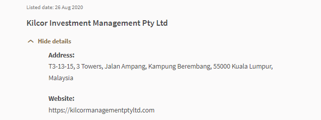 "투자자 경고 목록 투자자 경고 목록은 mas가 사용할 수 있는 정보를 기반으로 i) mas에 의해 허가 또는 규제를 받았거나 다른 방식으로 잘못 인식되었을 수 있는 사람의 목록을 제공합니다. mas에 의해 승인, 인정 또는 등록된 것으로 잘못 인식되었거나 잘못 인식되었을 수 있는 비즈니스 신탁 또는 집합 투자 계획의 단위 제안 iii) mas에 제출 또는 등록된 문서로 작성되거나 동봉됩니다. 이 목록은 완전하지 않으며 발행 당시 mas에게 알려진 내용을 기반으로 합니다." 상장 날짜: 2020년 8월 26일 KILCOR INVESTMENT MANAGEMENT PTY LTD 세부정보 숨기기 주소: t3-13-15, 3 towers, jalan ampang, kampung berembang, 55000 kualalumpur, malaysia 웹사이트: https:// KILCOR managementptyltd.com