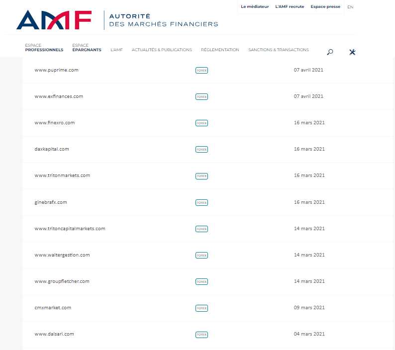 AMF(Autorité des Marchés Financiers) 블랙리스트에 오른 회사 또는 웹사이트, 규제 대상 회사에 대한 경고 및/또는 찬탈 목록입니다.