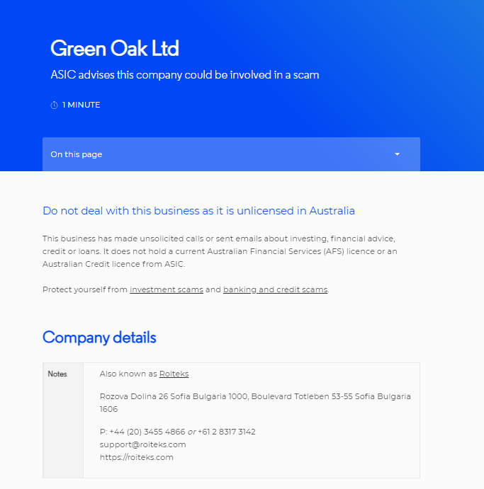 Green Oak LTDasic은 이 회사가 사기 페이지에 연루되었을 수 있다고 조언합니다. 읽는 시간: 이 페이지의 1분은 호주에서 허가되지 않은 비즈니스이므로 이 비즈니스를 다루지 않습니다. 이 비즈니스는 투자, 재정 조언, 신용 또는 대출에 관해 원치 않는 전화를 걸거나 이메일을 보냈습니다. 현재 호주 금융 서비스(afs) 라이센스나 ASIC의 호주 신용 라이센스를 보유하고 있지 않습니다. 투자 사기, 은행 및 신용 사기로부터 자신을 보호하세요. 회사 세부 정보 메모라고도 함 ROITEKS rozova dolina 26 sofia bulgaria 1000, boulevard totleben 53-55 sofia bulgaria 1606 전화: +44 (20) 3455 4866 또는 +61 2 8317 3142 support@ ROITEKS .com https:// ROITEKS .com