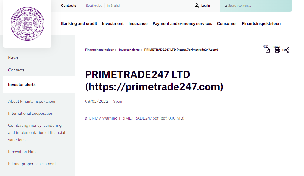 투자자 경고 투자자 경고 - PRIMETRADE247 LTD.