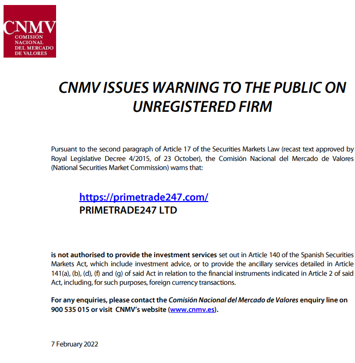 PrimeTrade247주식회사 (https:// PrimeTrade247 .com) 2022년 9월 2일 스페인 cnmv는 증권 시장법 제17조의 두 번째 단락(10월 23일 2015년 4월 왕실 법령에 의해 승인된 개정 텍스트)에 따라 미등록 회사에 대해 대중에게 경고를 발령했습니다. nacional del mercado de valores(국가증권시장위원회)는 다음과 같이 경고합니다. PrimeTrade247 Ltd는 투자 조언을 포함하여 스페인 증권 시장법 제140조에 명시된 투자 서비스를 제공하거나 제141(a), (b), (d), (f)조에 자세히 설명된 보조 서비스를 제공할 권한이 없습니다. ) 및 (g) 해당 법률의 제2조에 명시된 금융 상품과 관련된 해당 법률의 (해당 목적을 위한 외화 거래 포함). 문의 사항이 있는 경우 comisión nacional del mercado de valores 문의 라인(900 535 015)으로 연락하거나 cnmv 웹사이트(www.cnmv.es)를 방문하십시오. 2022년 2월 7일.