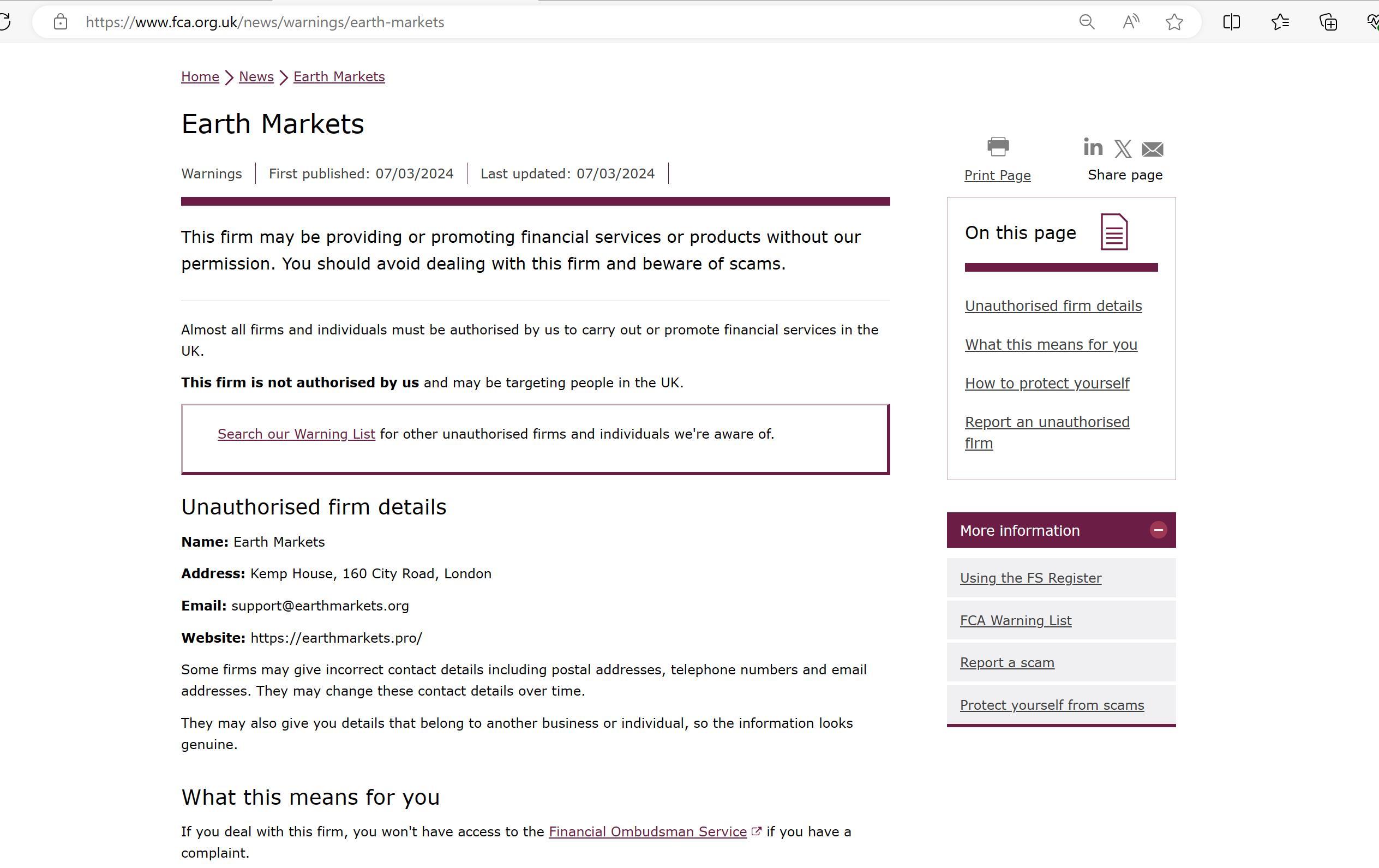 최초 게시일: 2024년 7월 3일 최종 업데이트일: 2024년 7월 3일 이 회사는 당사의 허가 없이 금융 서비스나 상품을 제공하거나 홍보할 수 있습니다. 이 회사와의 거래를 피하고 사기를 조심해야 합니다. 거의 모든 회사와 개인은 영국에서 금융 서비스를 수행하거나 홍보하기 위해 당사의 승인을 받아야 합니다. 이 회사는 우리의 승인을 받지 않았으며 영국에 있는 사람들을 대상으로 할 수 있습니다. 승인되지 않은 회사 세부정보 이름: Earth Markets 주소: kemp house, 160 city road, london 이메일: support@earthmarkets.org 웹사이트: https://earthmarkets.pro/ 일부 회사에서는 우편 주소, 전화번호, 이메일 주소를 포함한 잘못된 연락처 정보를 제공할 수 있습니다. 시간이 지남에 따라 이러한 연락처 정보가 변경될 수 있습니다. 또한 다른 기업이나 개인에 속한 세부 정보를 제공할 수도 있으므로 정보가 진짜처럼 보입니다.