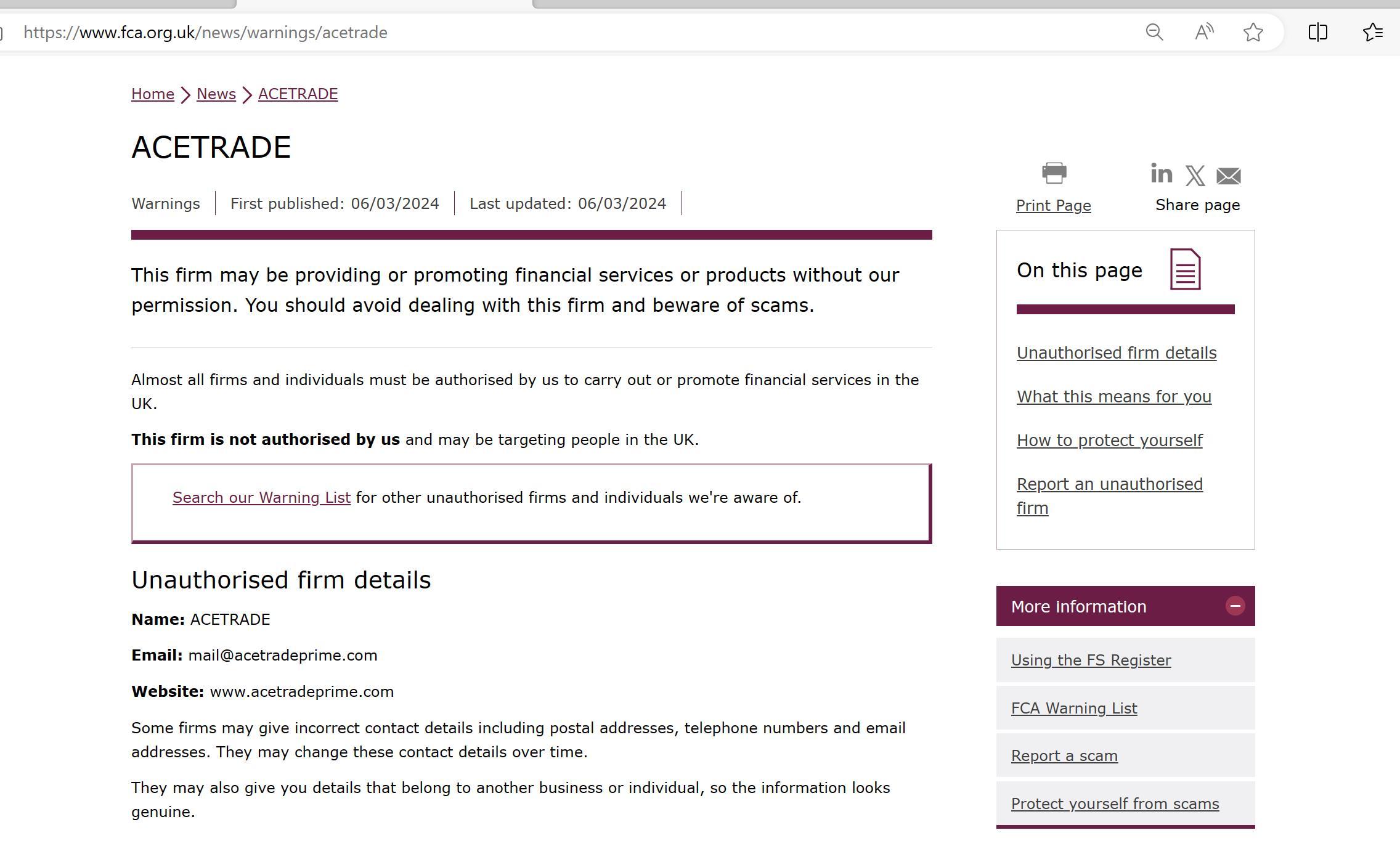 FCA 무단 회사 경고 목록 ACETRADE.