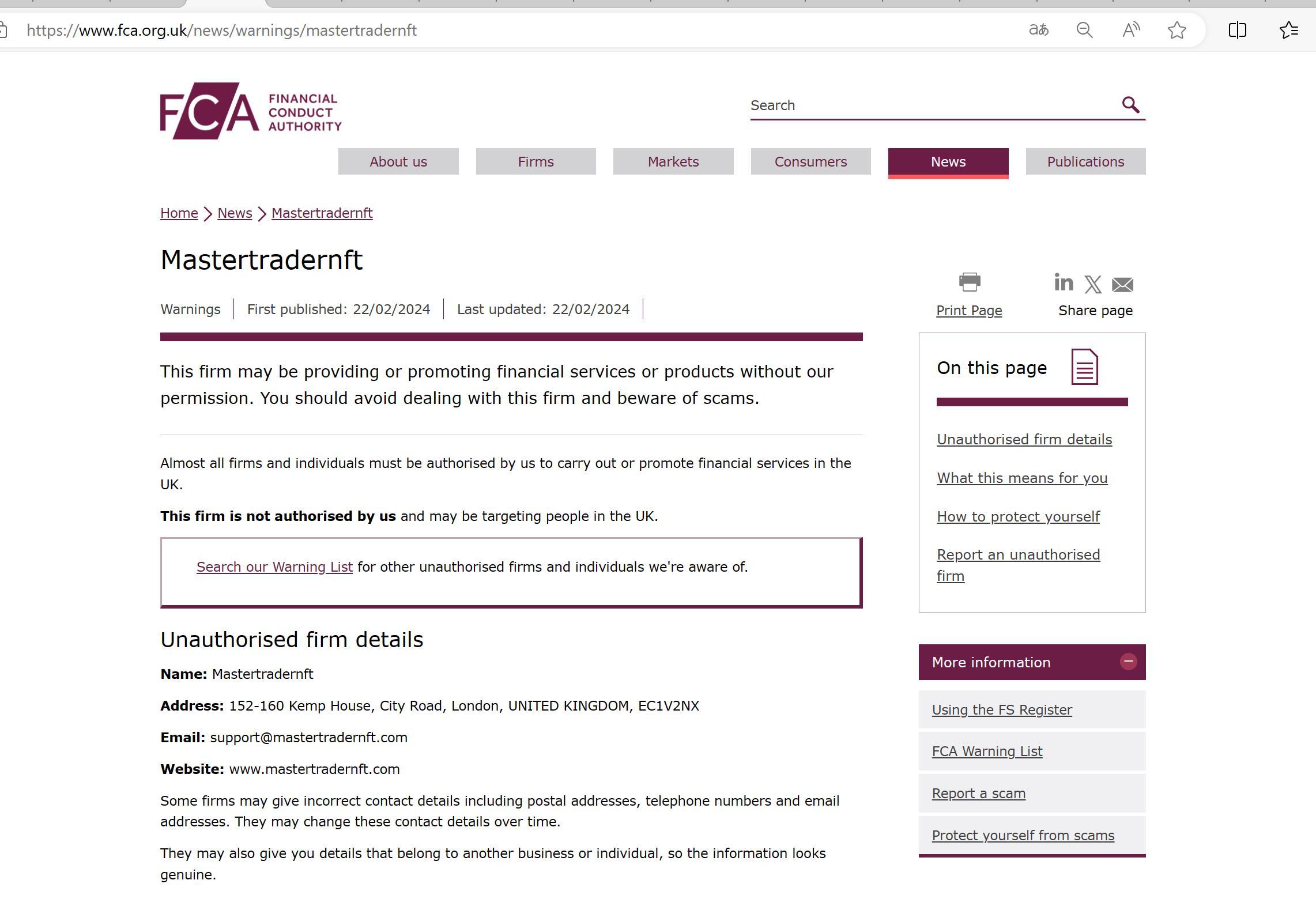FCA 미승인 업체 경고 목록 Mastertradernft.